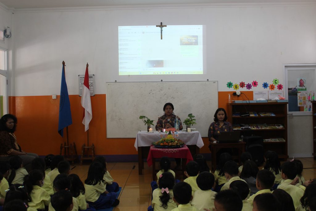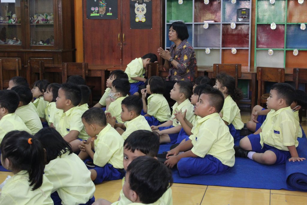 Seluruh anak-anak TK Strada Santa Clara berkumpul di ruangan aula lalu mengikuti ibadat bersama yang dipimpin oleh ibu Elis.